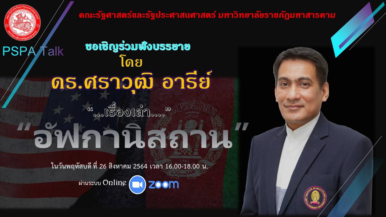 ขอเชิญชวนนักศึกษา คณาจารย์และผู้สนใจร่วมฟัง PSPA Talk “…เรื่องเล่า อัฟกานิสถาน… 20 สิงหาคม 202120 สิงหาคม 2021 admin admin20 สิงหาคม 2021